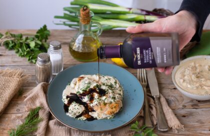 Add the crème fraîche, stir for a few seconds and remove from the heat. Then add the chopped herbs and lemon juice. Season with salt and pepper to taste. Serve the chicken breasts warm, with the sauce and give the dish a final gourmet flourish with a drizzle of De Nigris Platinum Label Balsamic Vinegar of Modena.
