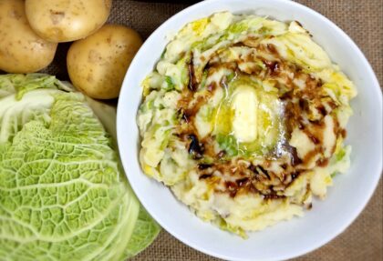 While potatoes are cooking, place chopped cabbage in a pan of cold, salted water, bring to boil. Cook for three to five minutes or until the cabbage is just cooked. (You don’t want it to overcook, it needs to be al dente, for added texture and flavour).  Drain the cabbage.