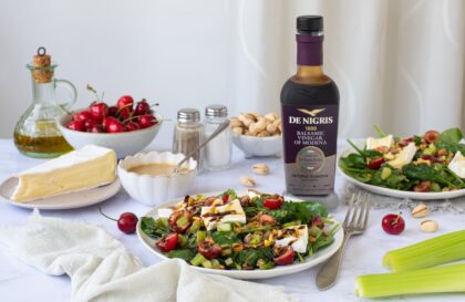 Divide the salad between two plates, and top with chopped pistachios and sliced brie, then drizzle with the remaining dressing and a final flourish of De Nigris Recipe Platinum Label Balsamic Vinegar, before serving.