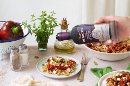 Place the cooked quinoa and oil in a large bowl and fluff with a forkAdd pepperscrumbled feta and oregano leavesDrizzle with De Nigris Platinum Label Balsamic Vinegar and serve.