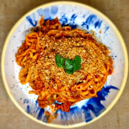 Drain the pasta, toss it in the sauce, and serve in bowls, each topped with a handful of the crunchy breadcrumbs, a sprinkle of parmesan, some freshly ground black pepper, and a garnish of fresh coriander leaves.
