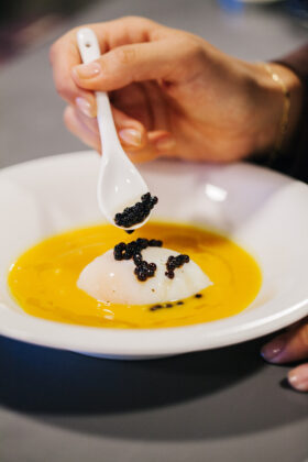 In questo piatto l’unicità dell’uovo cotto a 64° e la dolcezza della zucca sono esaltati dal gusto esplosivo delle nostre Perle Nere di Modena.